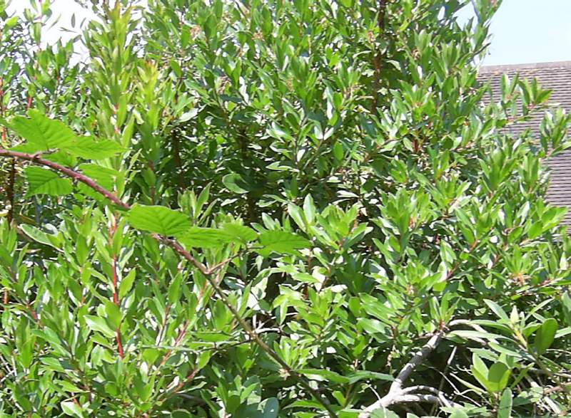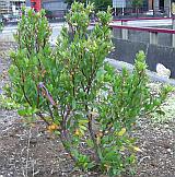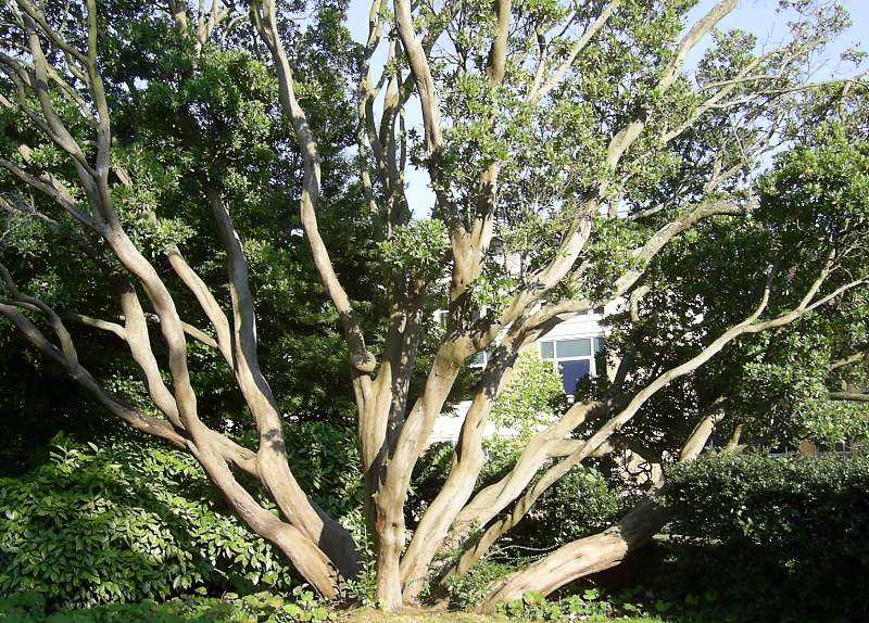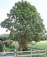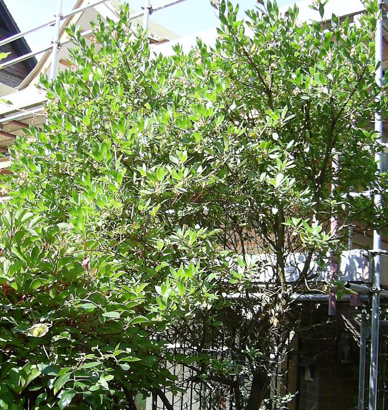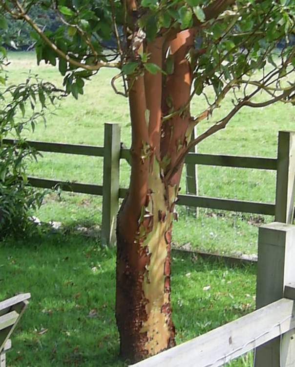 The bungalow, Coronation Avenue, Leigh Woods - Half way between the Humphrey Repton arch and the Forestry Commission car park. Red bark is visible from the road. Arbutus menziezii (the Madrona). [1] |